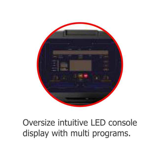 6 window LED display with dot matrix showing time, speed, distance, calories, pace, heart rate etc.